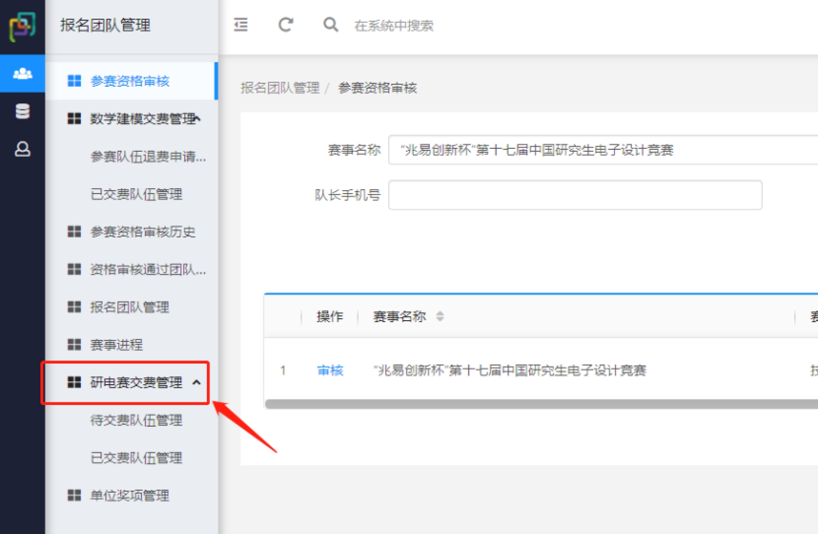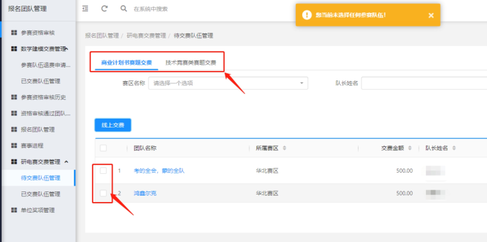2.参赛资格审核通过后,在研电赛缴费管理界面,选择商业计划书或技术类竞赛对应的参赛团队,勾选对应缴费赛队,并按照说明要求线上缴费。