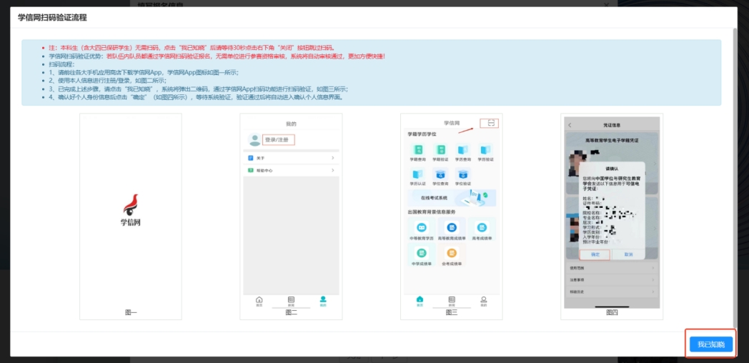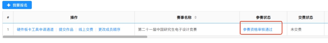 1.等待选手所在研究生培养单位负责人审核。审核通过后,请在【个人中心】【我的赛事】中查看,此时参赛状态变更为【参赛资格审核通过】。如长时间审核状态未变更,请联系所在高校竞赛负责人。如使用学信网扫码核实身份将直接通过审核。
