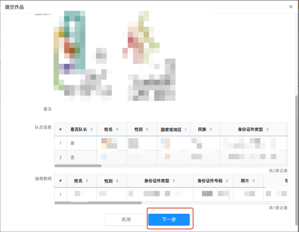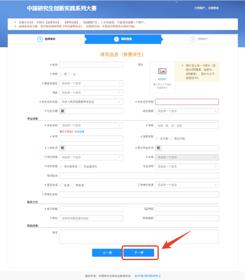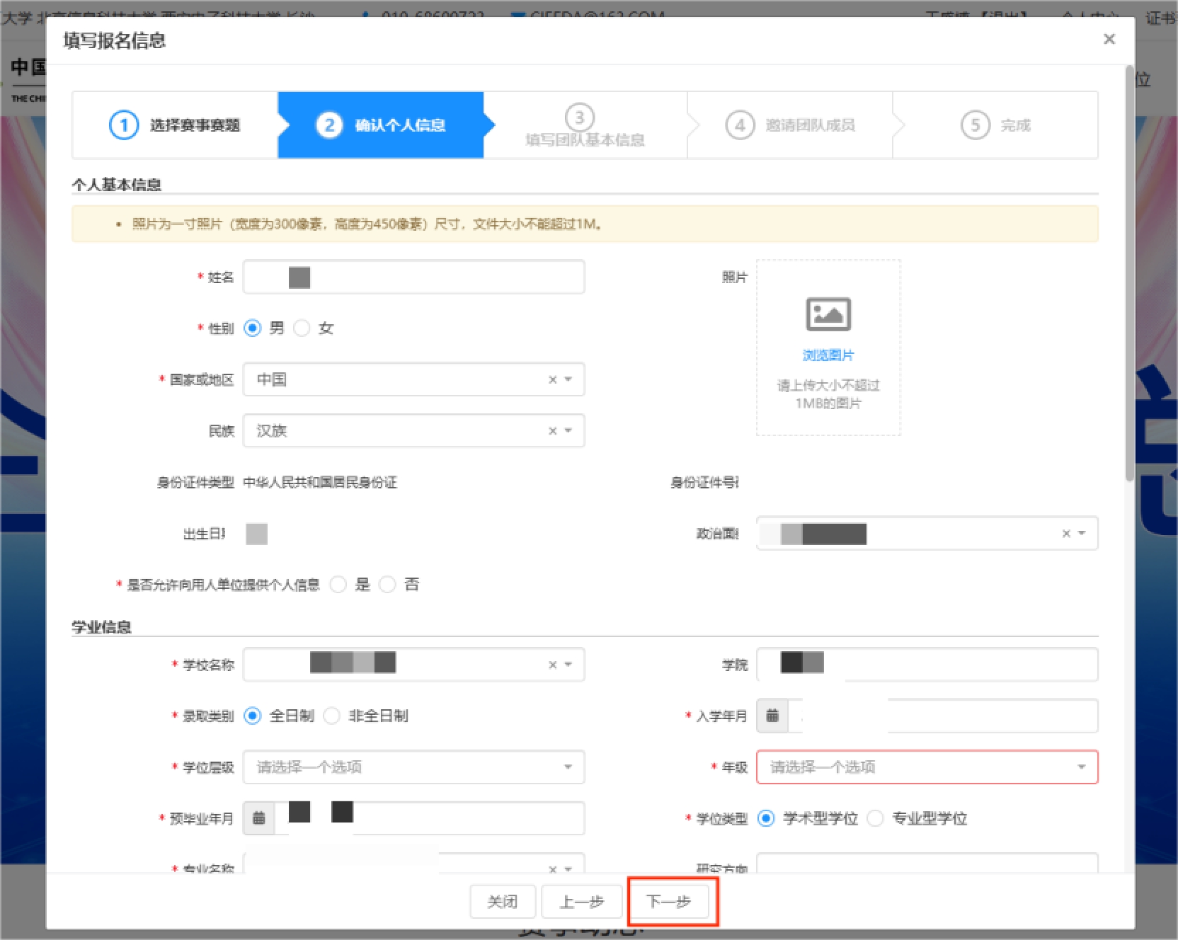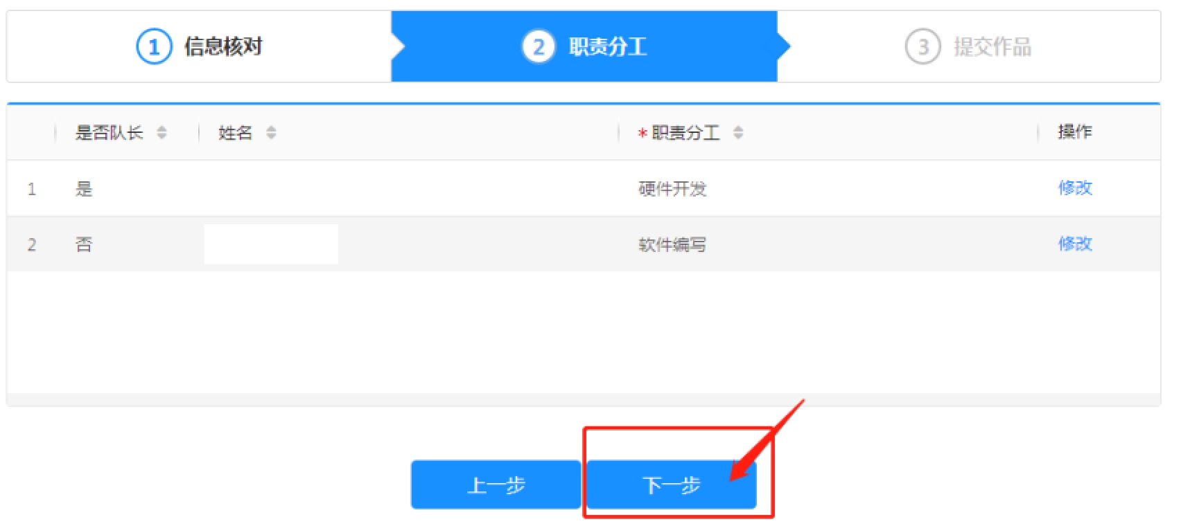 4.填写信息(参赛队员),填写完毕点击【下一步】。