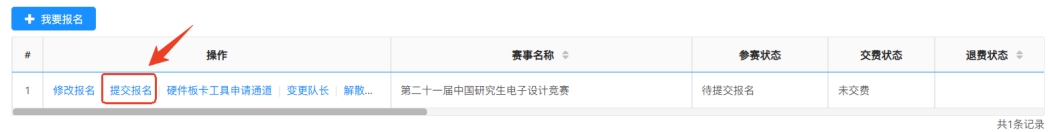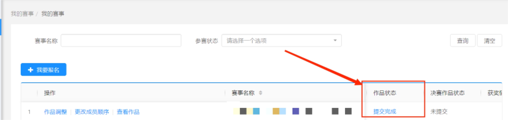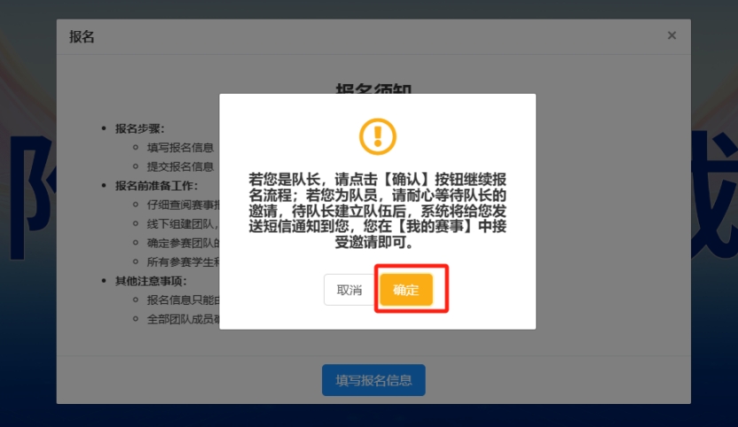 1.若所有团队成员都已接受,请确认报名信息是否符合报名要求,确认无误后进入【个人中心】【我的赛事】功能进行提交报名操作。