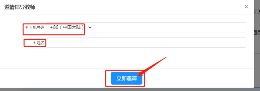 2.输入队员/指导教师手机号码与姓名,点击【立即邀请】。