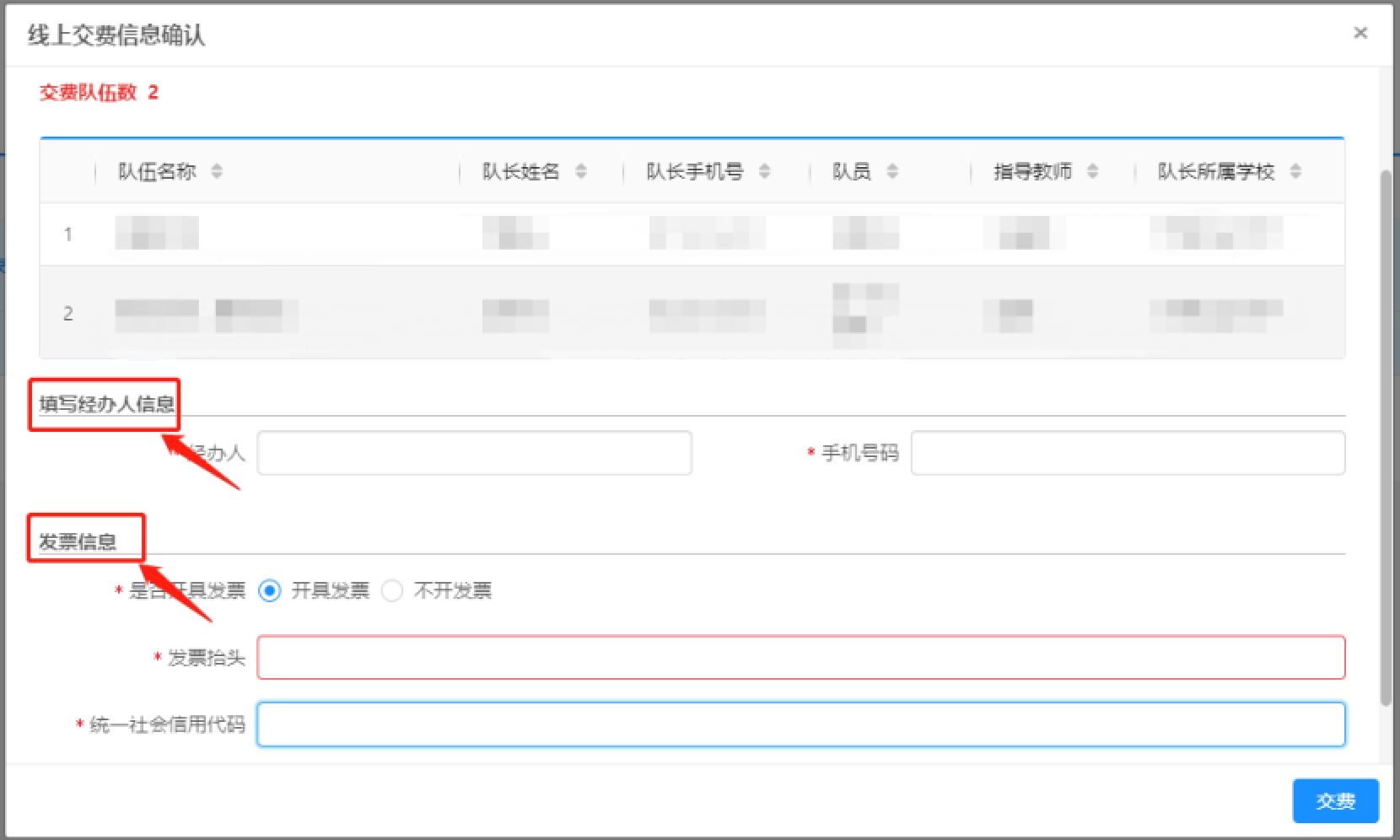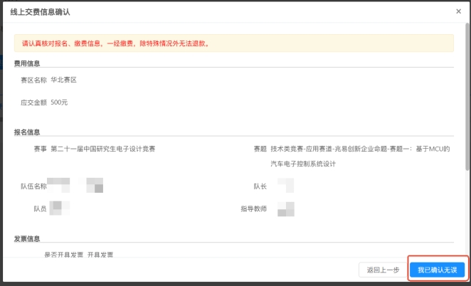 2.技术竞赛将弹出缴费页面,根据页面提示的缴费信息缴费。如需开具发票,请填写发票抬头等重要信息,填写完成确认信息无误后点击【我已填写完毕】。
