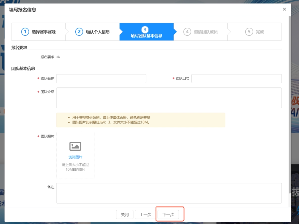 11.填写队伍基本信息、团队口号、团队名称、上传团队照片,点击【下一步】。