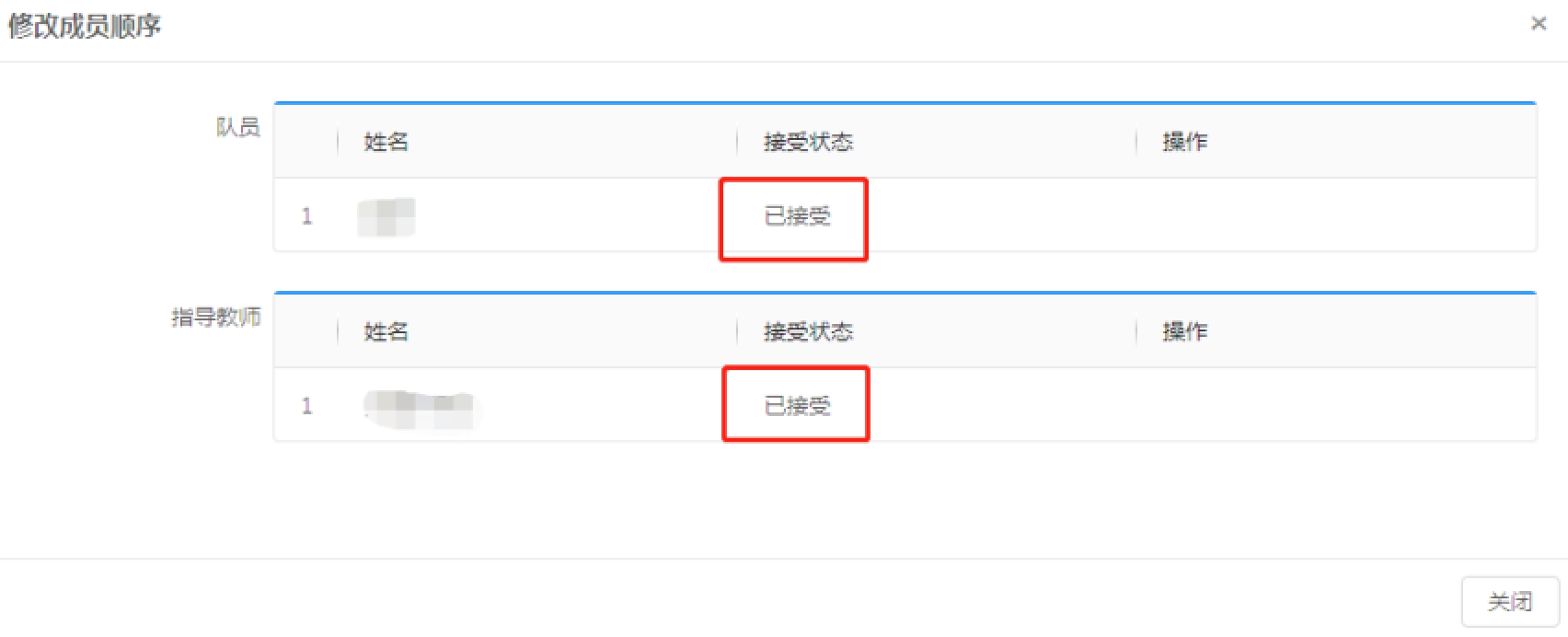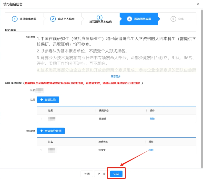 3.邀请完毕,队员/指导教师确认邀请后,点击【完成】