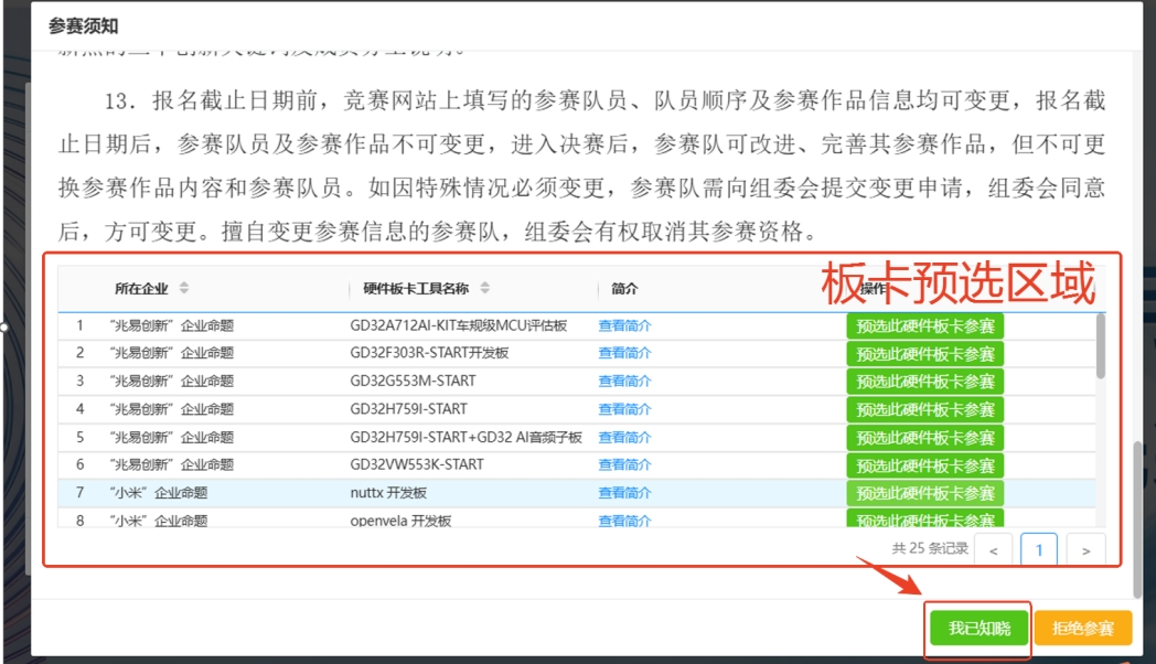 4.页面将会弹出参赛须知及预选板卡;如需选择板卡,点击相应选项;如不需选择板卡,点击我已知晓。
