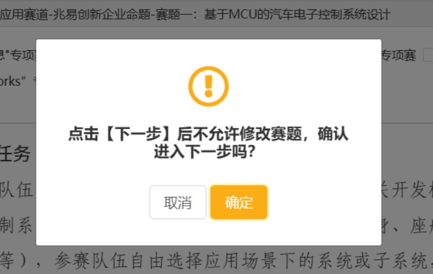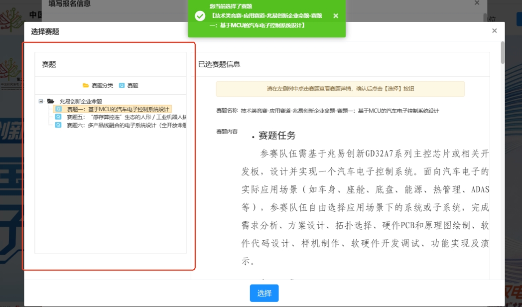 5.弹出赛题窗口,本教程以【应用赛道】类【兆易创新命题】为例,点击【选择】。