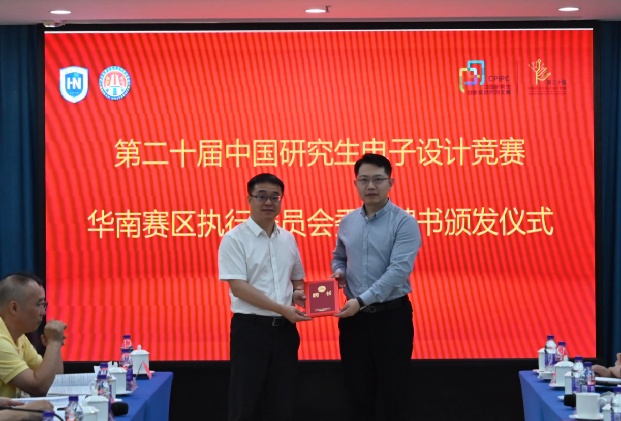 会议举行第二十届中国研究生电子设计竞赛华南赛区执行委员会委员聘书颁发仪式。中国研究生电子设计竞赛组委会副秘书长刘霆轩为在场的委员颁发聘书。随后全体参会人员前往海南大学国际学术交流中心一楼进行合影。